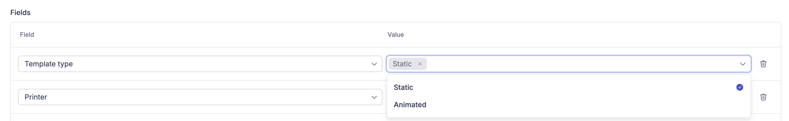Select fields can be used to add metadata to a template, which can be used by end-users to search and filter