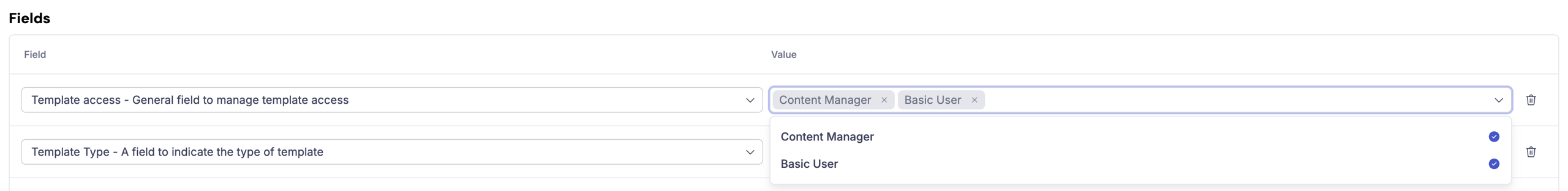 Fields: Fields are used to add metadata and permissions to a template. Admins can choose from the fields that are made available for templates