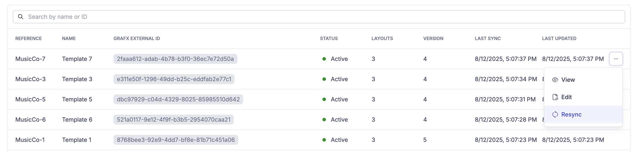 - From the context menu (⋮), you can quickly View, Edit, or Resync a template.