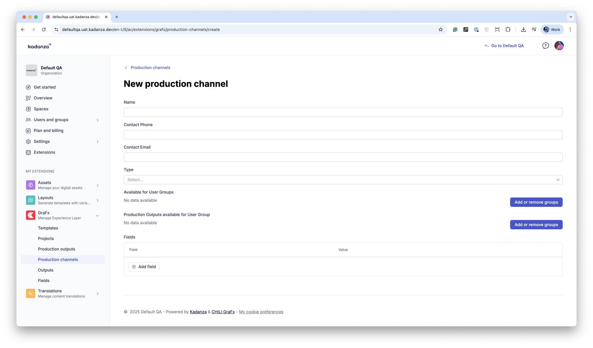 Click New production channel to open the configuration form.