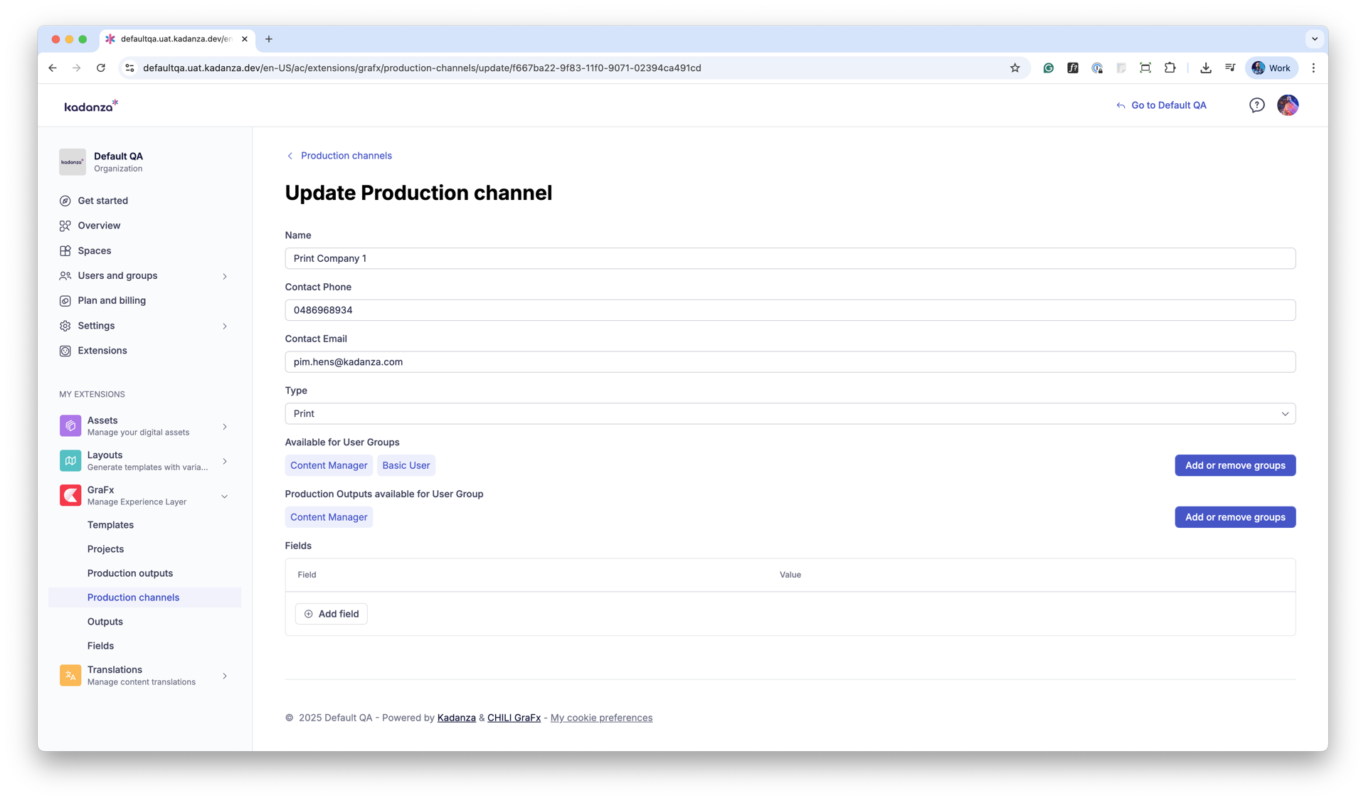- Production Channel Summary: Shows channel name, type (e.g., print), and contact details (email and phone).