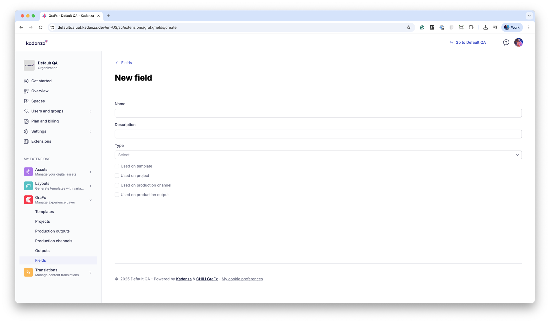 - Used on Templates / Projects / Channels / Outputs: Indicators showing where the field is applied.