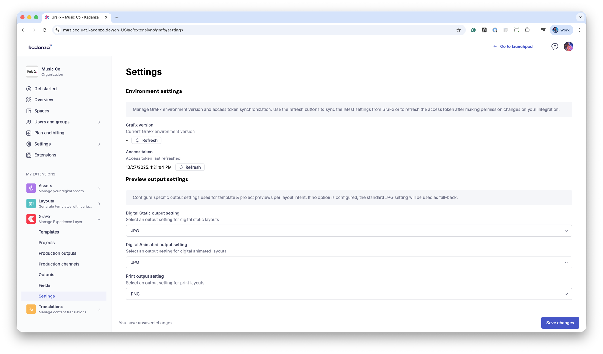 Whenever changes are made in your GraFx Studio environment (like permission changes in the integration), the latest settings from GraFx Studio should be synced with Kadanza. Use the refresh buttons to sync the latest settings from GraFx or to refresh the access token after making permission changes on your integration.