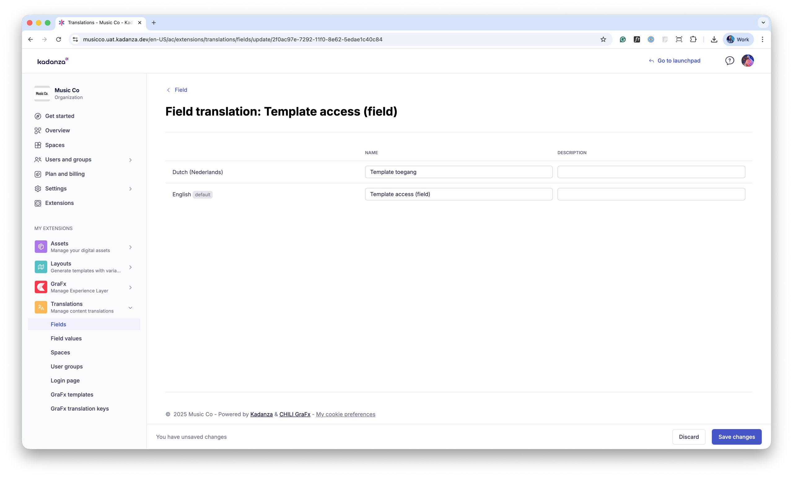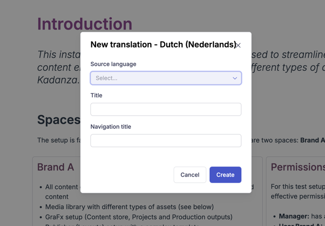 The Kadanza translations extension allows you to translate your content in different languages. A default language is set, and other languages are made available to translate your content. When content is translated, the UI is also translated.