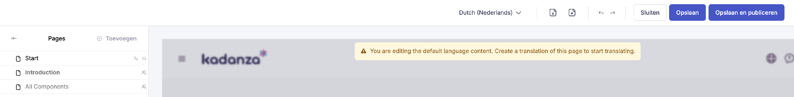 When you navigate to an untranslated page while in the editor, you will need to select the default language and create a translation before you can edit the content. A warning message will be shown to inform the admins. Untranslated pages have a visual indication in the page tree.